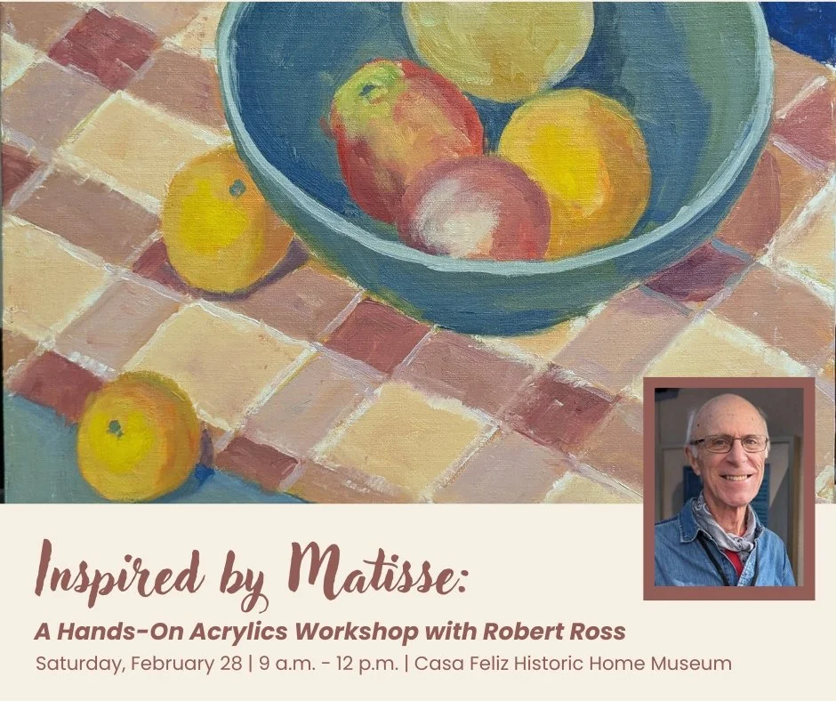 Join us for a relaxed, hands-on morning of artmaking at Casa Feliz with our Matisse Still Life Workshop, led by acclaimed Winter Park artist Robert Ross. Inspired by Henri Matisse’s bold color, simplified forms, and joyful approach to composition, this approachable workshop is perfect for beginners and experienced painters alike. Robert will guide participants step by step as you create a vibrant still life that captures the spirit of Matisse—no prior experience required.